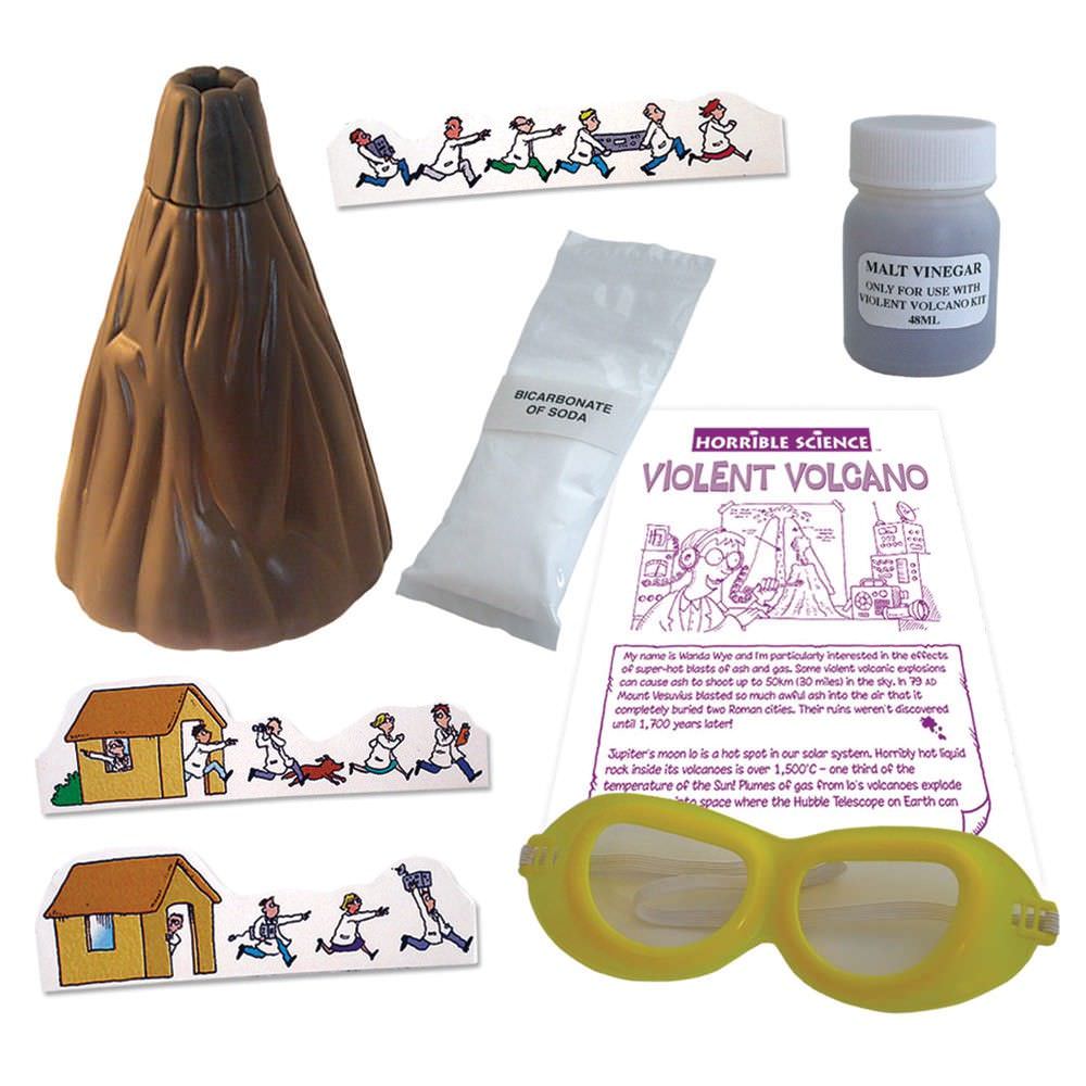 - kit-ul contine macheta din plastic a vulcanului, bicarbonat de sodiu, ochelari de protectie, acid tartric, mini carduri si fluturasul cu instructiuni "Horrible Info".