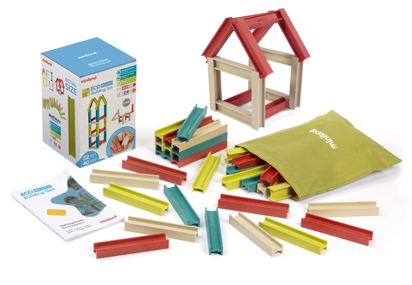 Setul de construcții contine 32 de grinzi colorate confecționate din materiale ecologice pentru a reduce impactul lor asupra mediului.