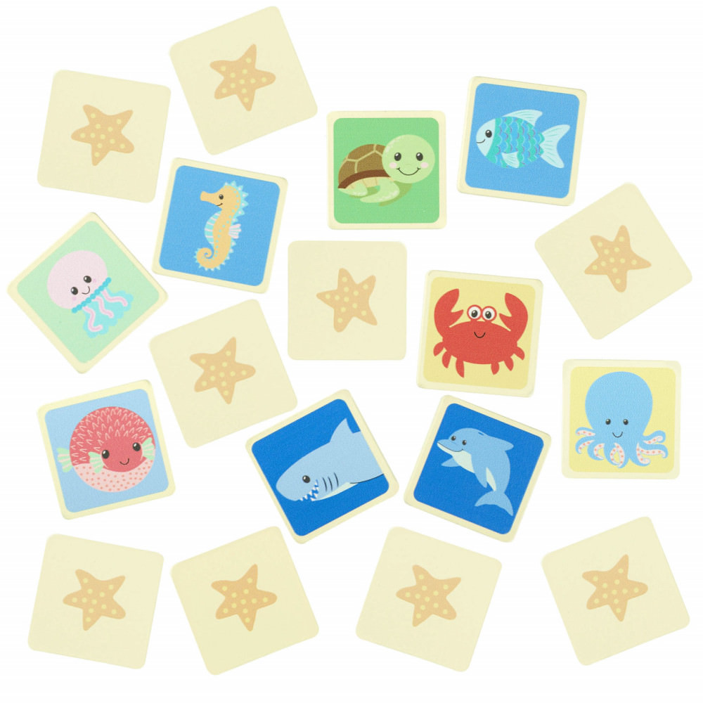 O versiune pentru cei mici a jocului de memorie, cu perechi de piese din lemn cu diferite personaje din viața marină. Copilul întoarce pe rând fiecare piesă și le face perechi pe cele identice! Ambalat în săculeț din bumbac cu cordon pentru a depozita comod piesele, fiind perfect pentru călătorii.