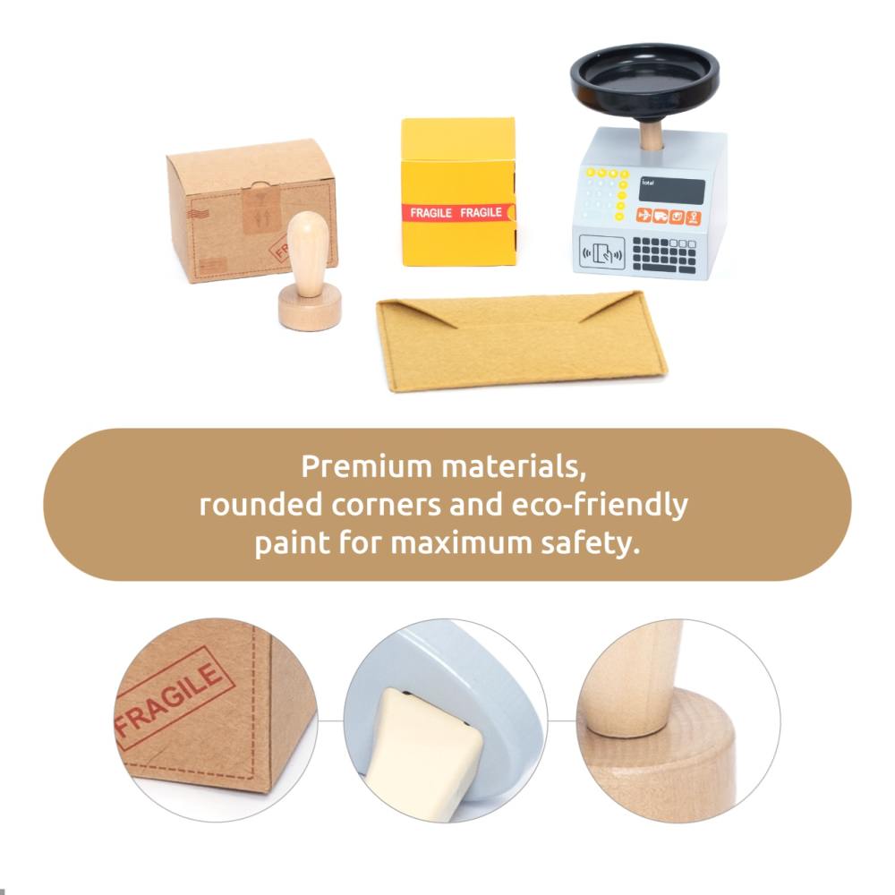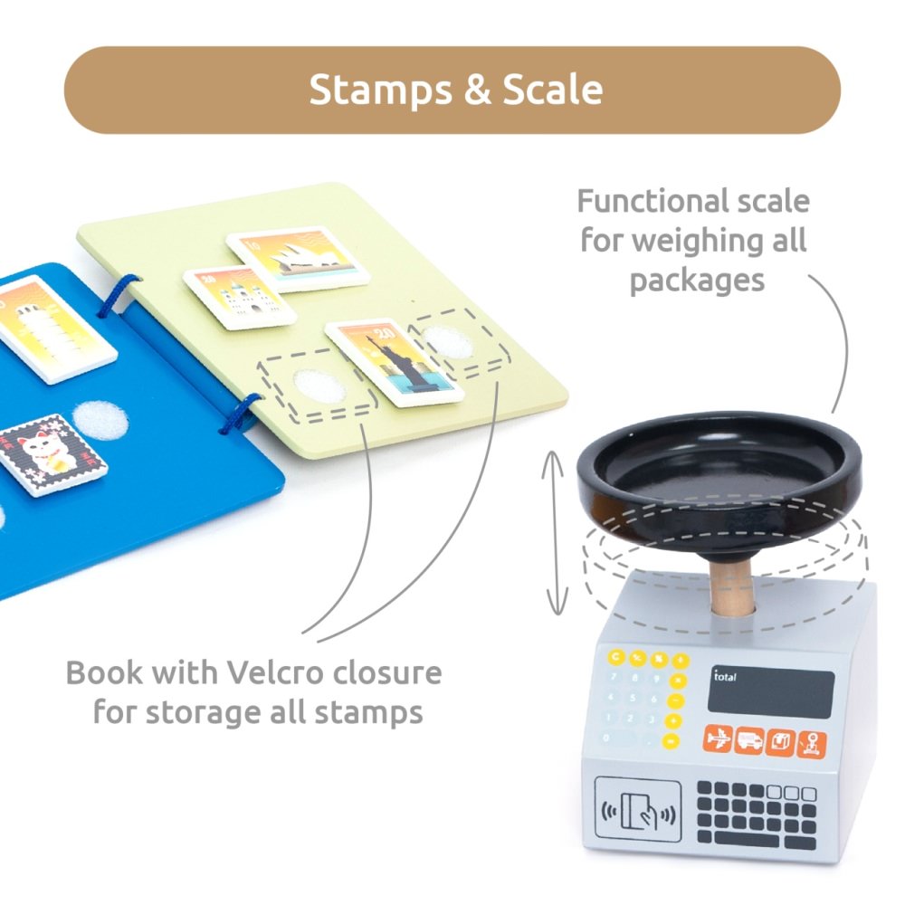 Set de joacă care conține toate accesoriile necesare pentru a deservi un oficiu poștal.