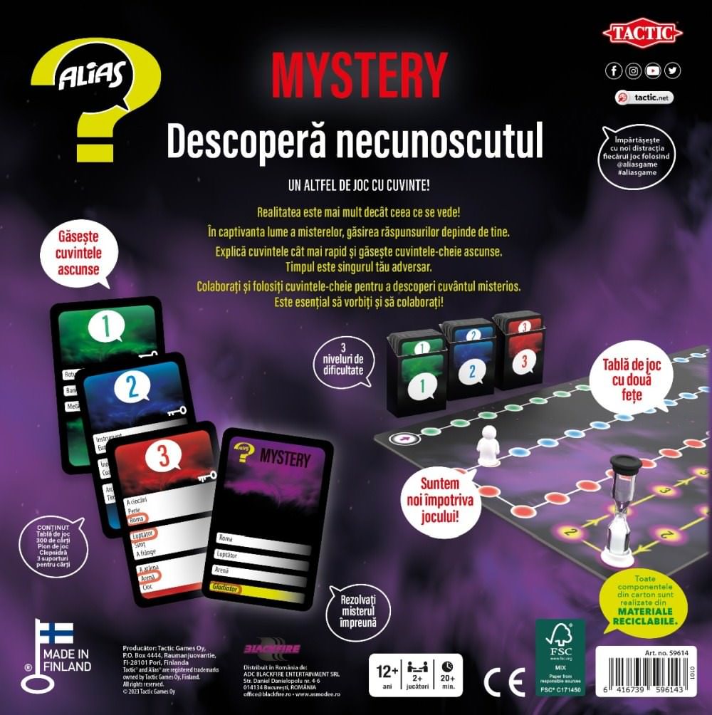 Mystery Alias este un joc potrivit pentru petrecerea timpului in familie sau cu prietenii, oferind momente pline de rasete si entuziasm. Cu reguli simple si o dinamica antrenanta, acest joc te va tine cu sufletul la gura si te va face sa-ti pui imaginatia si creativitatea la incercare.