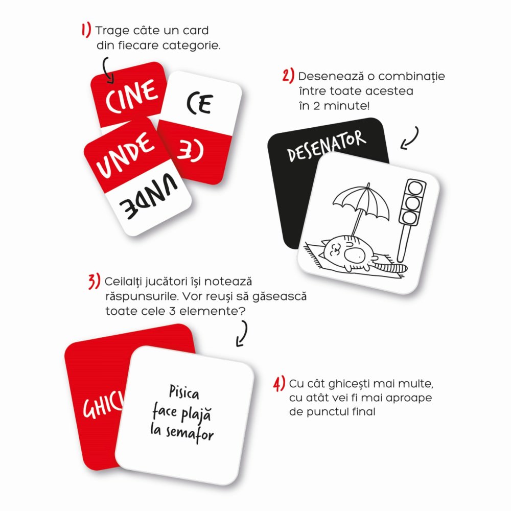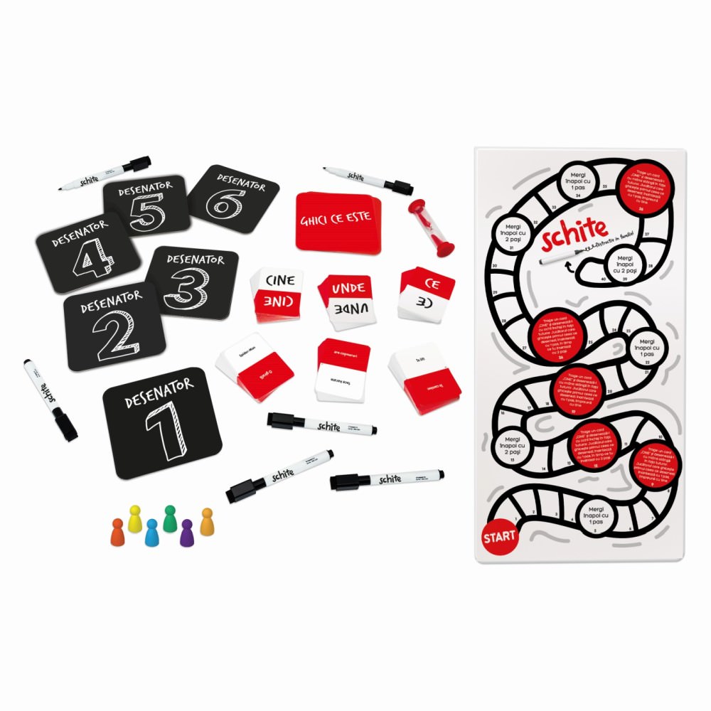 Jocul include 1 placa, 6 file de schite, 6 file Guess it, 150 de carti cu 300 de teme, 1 clepsidra, 6 piese, brosura de instructiuni.