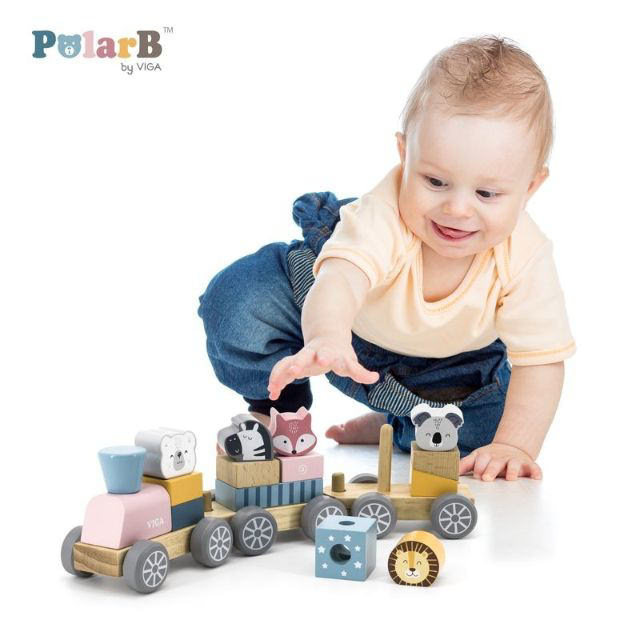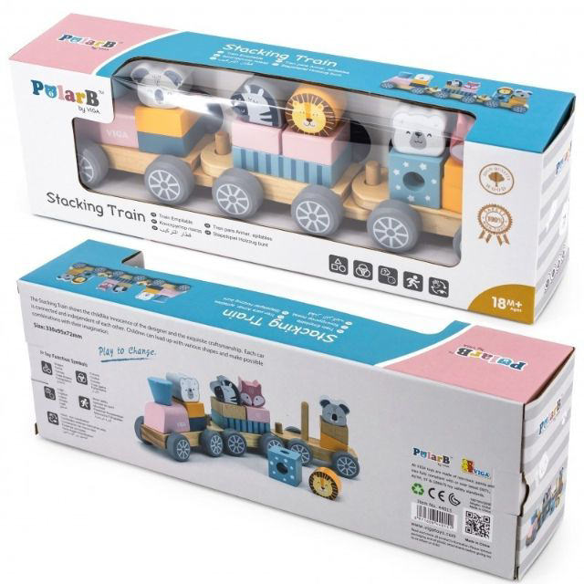 Jucarie educativa din lemn de inalta calitate, in culori pastelate. Copiii pot stivui diferitele forme, combinandu-le dupa propria imaginatie. Vagoanele trenului pot fi folosite impreuna sau separat.