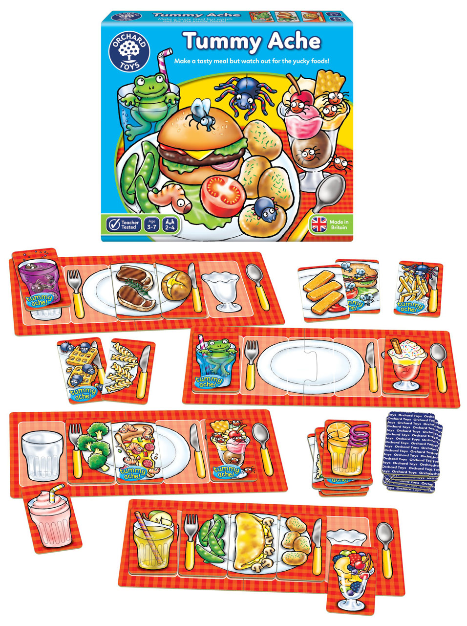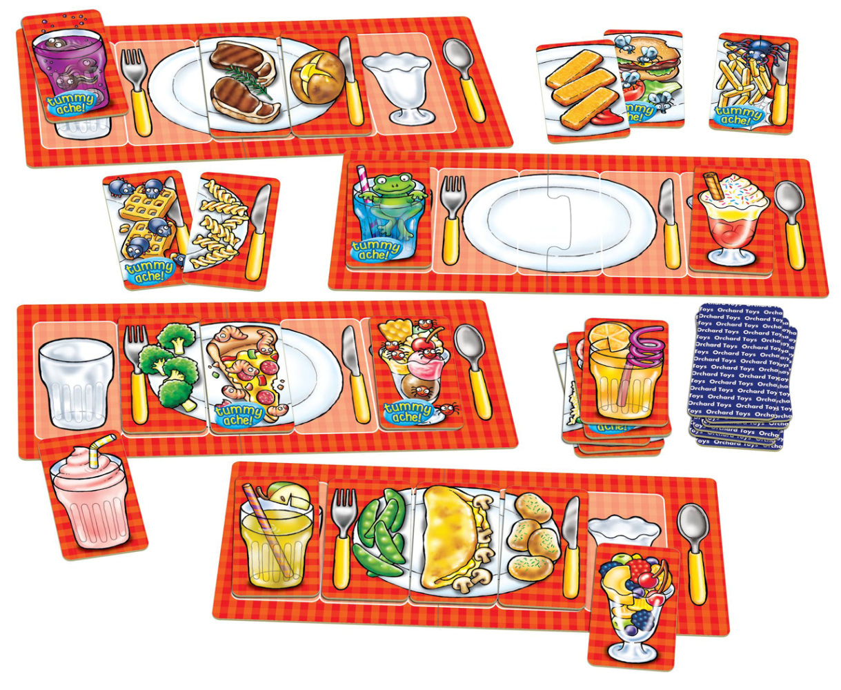Incercati sa prezentati un pranz sanatos pe plansa dvs de joc si fiti atent la combinatiile nepotrivite care va pot da dureri de burtica! Jucatorii ridica pe rand cartonase cu diverse alimente sau bauturi din teancul de pe masa si le aseaza in sectiunea potrivita de pe plansa de joc. Daca unul dintre jucatori ridica un cartonas"tummy ache", toti striga "Durere de burtica!" si jucatorul plaseaza cartonasul pe plansa pentru a fi inlocuit mai tarziu. Castigator este cel care va prezenta un meniu complet pe plansa sa de joc.