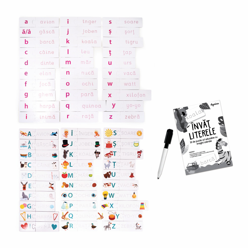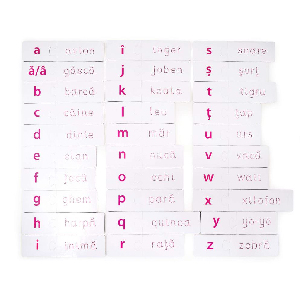 Dupa ce uneste toate piesele de puzzle, copilul incearca sa scrie cuvantul de pe fiecare cartonas (cu litere de mari pe fata si cu litere mici pe verso). Astfel, prin joc si exercitii simple, copilul invata foarte usor literele mari si mici ale alfabetului, asociindu-le cu elemente a caror denumire incepe cu literele respective, antrenand scrierea cuvintelor, tinerea corecta a instrumentului de scris, dezvoltandu-si miscarile fine ale mainilor.
