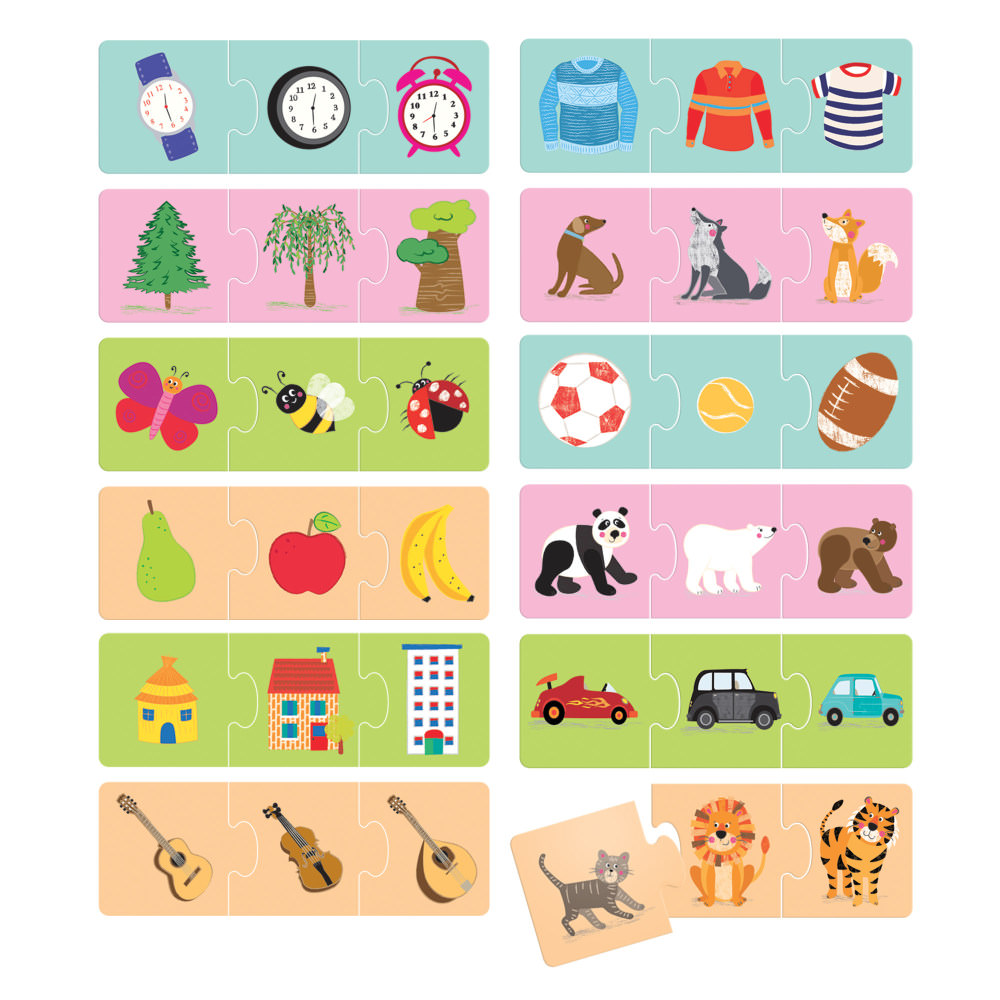 Un joc cu adevarat original de asociere! Analizati bine piesele si potriviti-le pe cele care se aseamana. Apoi le puteti regrupa in functie de categoriile de care apartin: 3 insecte, 3 prajituri, inghetata, 3 fructe si asa mai departe.