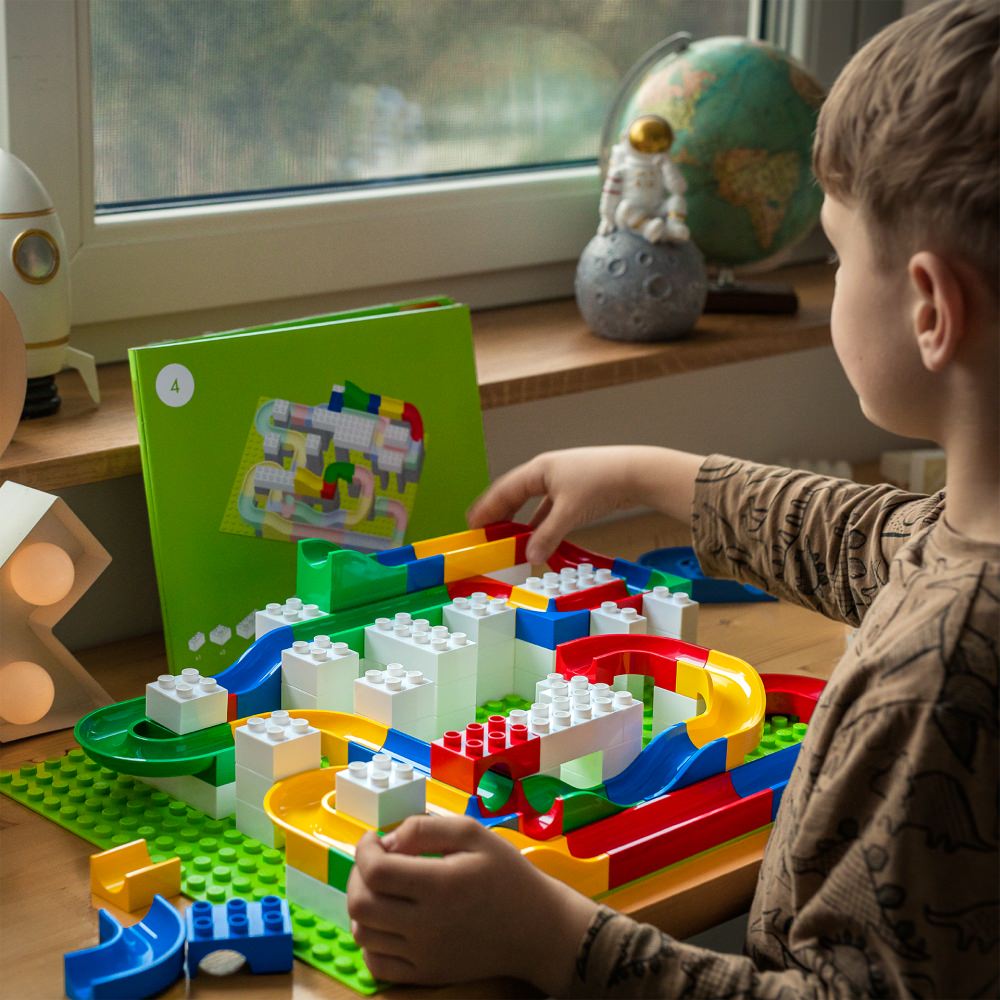 Contine toate elementele necesare pentru construirea de piste de marble run dinamice si spectaculoase: o placa mare de baza (32 x 44.8 cm), numeroase blocuri de constructie, multe elemente de rulare diferite, inclusiv noile tobogane si bilele din stanga si din dreapta. Brosura noastra de instructiuni cu cinci modele diferite de marble run poate fi folosita pentru inspiratie simpla sau ca esantion.