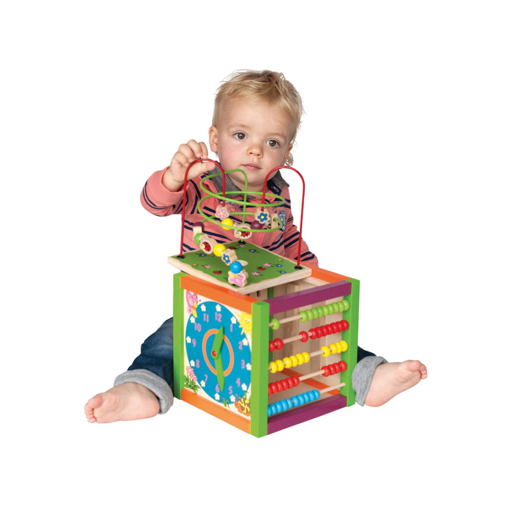 Contine: xilofon cu ciocan, ceas, tejghea, labirint si in partea superioara un labirint cu margele care pot fi miscate de-a lungul structurii de sarma.
