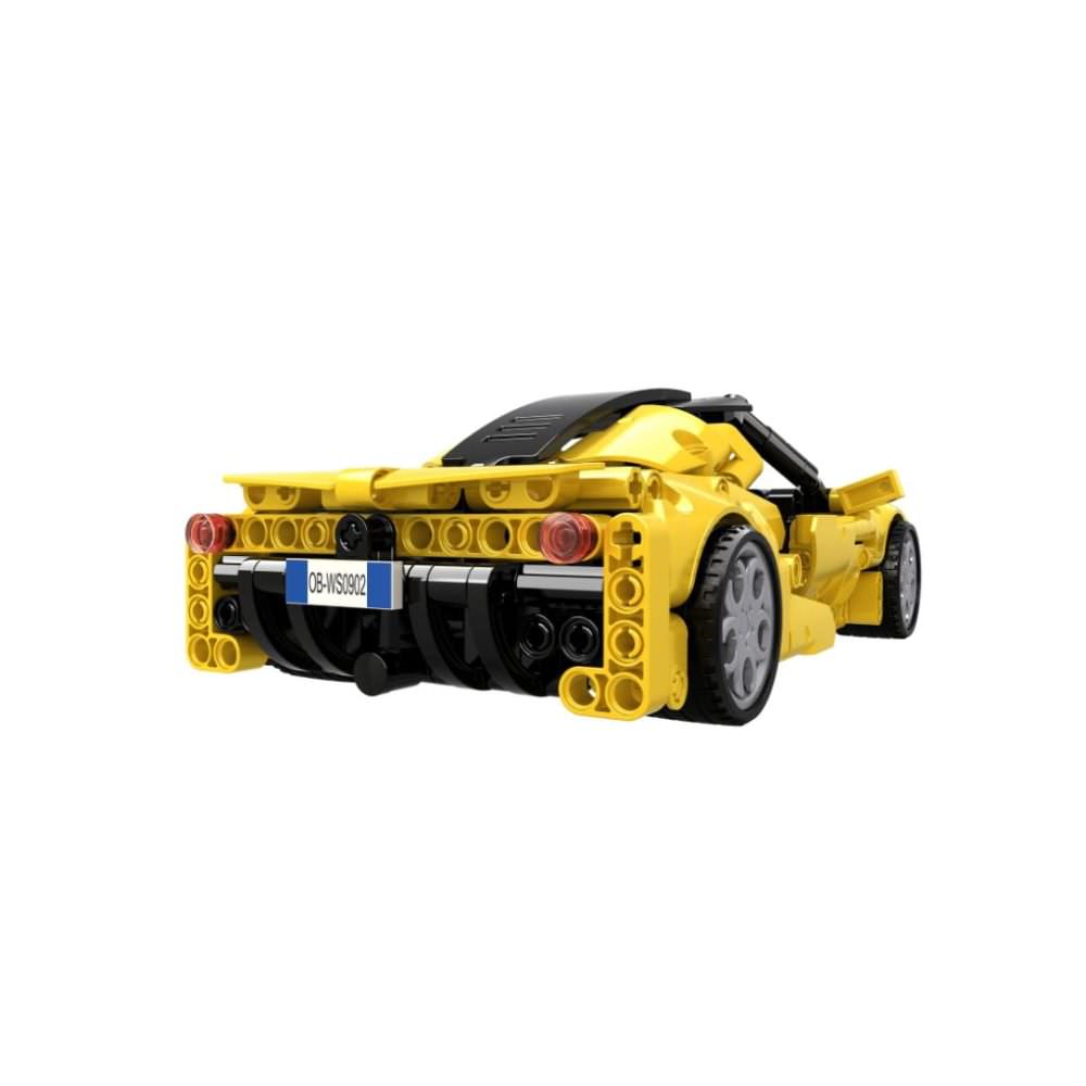 Masina sport galbena, care contine 414 de piese compatibile cu marcile traditionale, un motor de tragere inapoi si instructiuni de constructie. Imprimare de inalta calitate in loc de autocolante. Stifturi tehnice in culoarea principala a masinii.