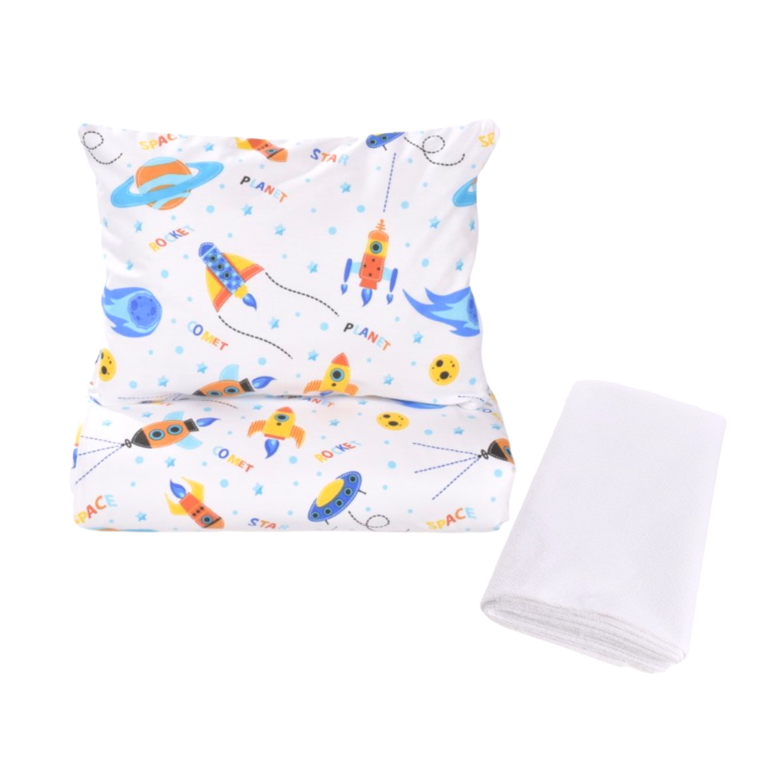 Lenjerie 3 piese model planete si rachete + protectie impermeabila patut 120x60 cm