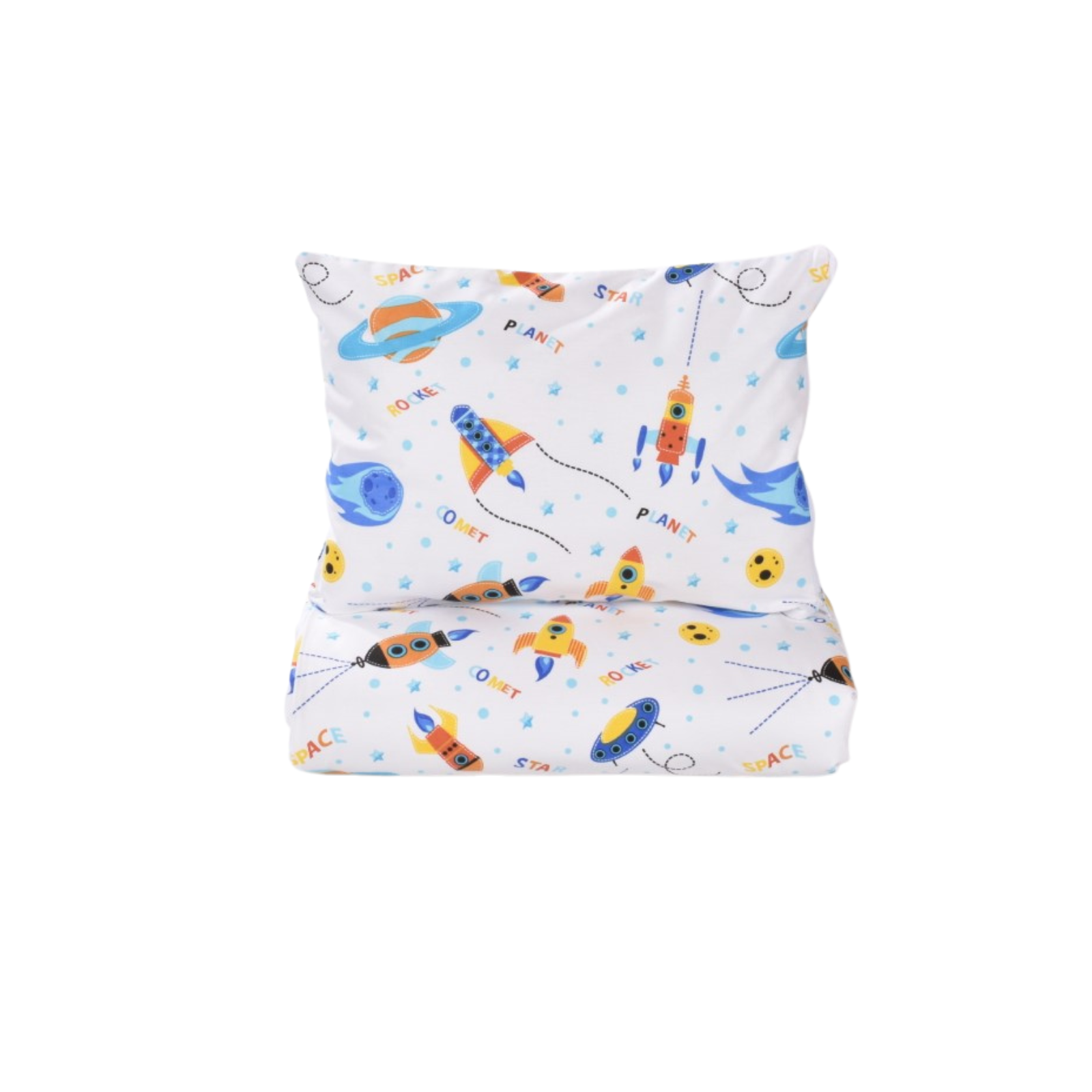 Lenjeria model Planete si rachete este realizata din bumbac 100%, moale, dens si foarte placut la atingere, certificat si sigur pentru copii inca de la nastere.