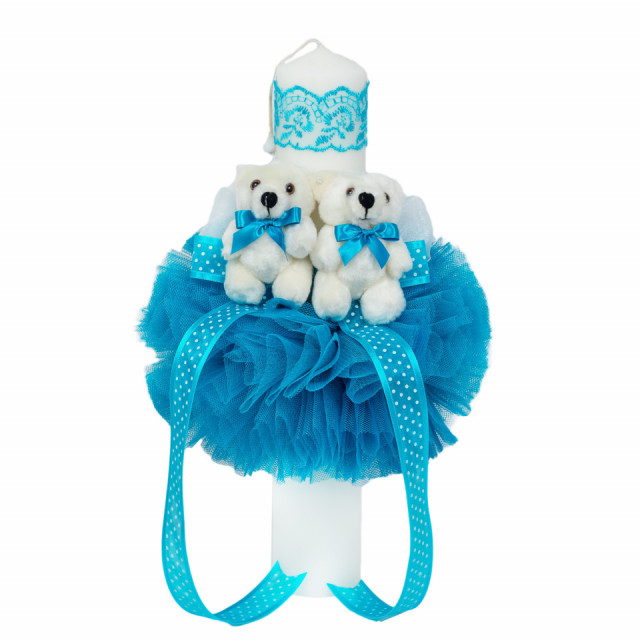 Lumanare botez 2 ursuleti, decor turcoaz, Denikos® 529Lumanare de botez eleganta, decorata cu dantela, fundite speciale si doi ursuleti simpatici.