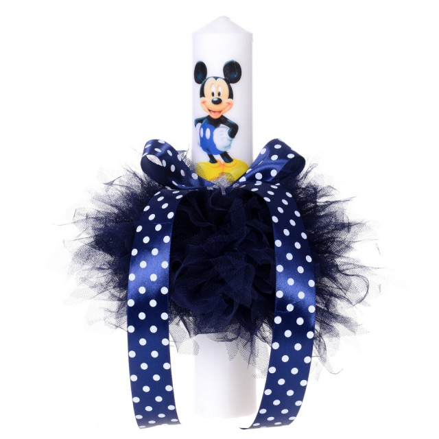 Lumanare botez baietel, tul bleumarin "ciufulit" si fundita cu buline, Denikos® 76