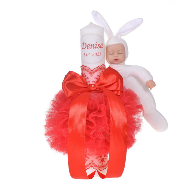 Lumanare botez cu iepuras, personalizata si trusou botez in landou, decor Rosu, Denikos® 798DESCRIERE