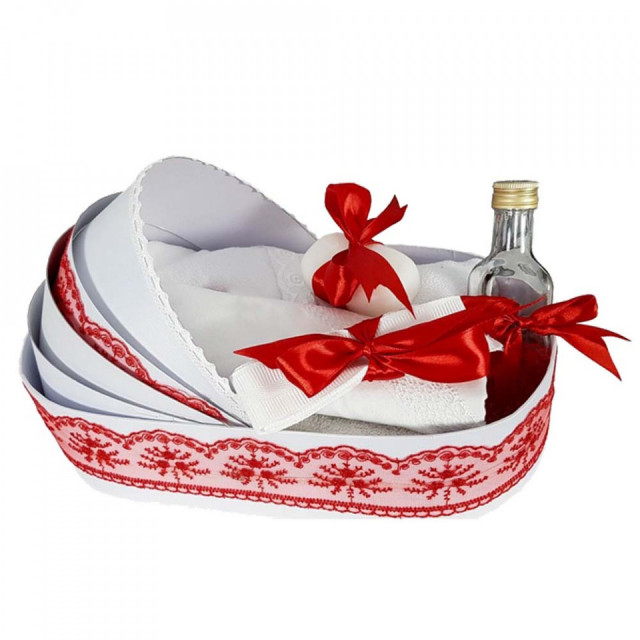 Set special creat pentru ceremonia de botez. Setul este alcatuit din trusou complet ambalat intr-o cutie tip landou si o lumanare personalizata cu numele copilului decorata cu un glob din tul rosu, dantela, fundita asortata si o jucarie iepuras.