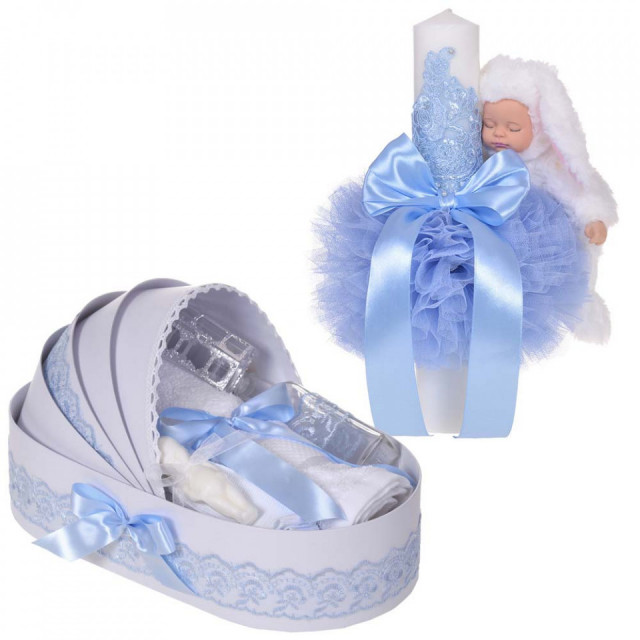 Set special creat pentru ceremonia de botez. Setul este alcatuit din trusou complet ambalat intr-o cutie tip landou si o lumanare decorata cu un glob din tul bleu, dantela, fundita asortata si un iepuras pufos simpatic.