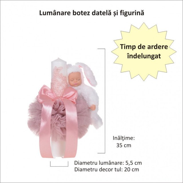 Set special creat pentru ceremonia de botez. Setul este alcatuit din trusou complet ambalat intr-o cutie tip landou si o lumanare decorata cu un glob din tul roz pudra, dantela, fundita asortata si un iepuras pufos simpatic.
