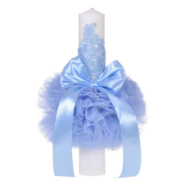 Lumanare botez eleganta cu tul, dantela si fundita, decor bleu, Denikos® 709