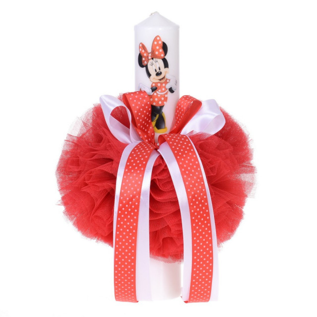 Lumanare de botez dragalasa decorata cu tul rosu si fundite asortate.