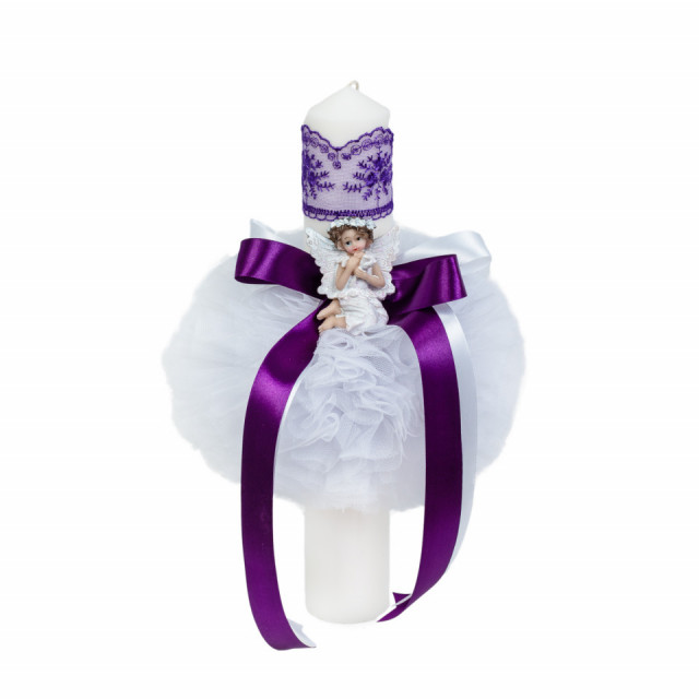 Lumanare botez glob cu ingeras, decor MOV, Denikos® 520Lumanare de botez eleganta decorata cu ingeras, dantela si fundite speciale.