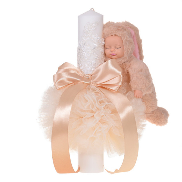 Lumanare botez glob iepuras pufos si trusou botez in landou, decor Ivoire, Denikos® 767DESCRIERE