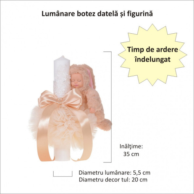Lumanare botez jucarie iepuras pufos si dantela, decor crem / ivoire, denikos®