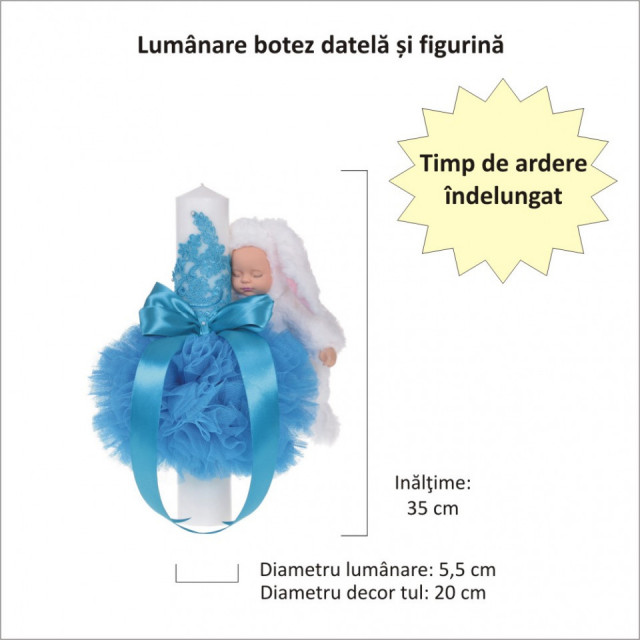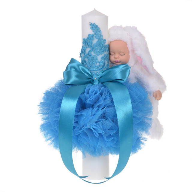 Lumanare botez jucarie iepuras pufos si dantela, decor turcoaz, denikos® 719