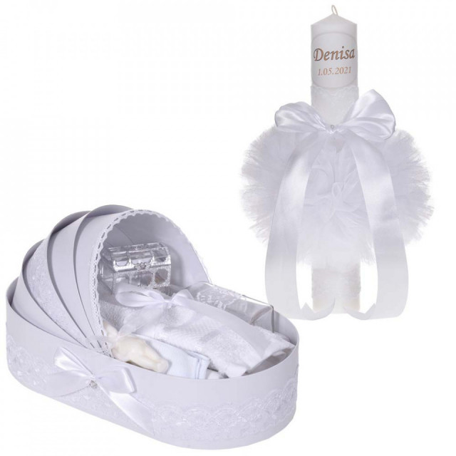 Lumanare botez personalizata si trusou botez in landou, decor dantela Alba, Denikos® 871DESCRIERE