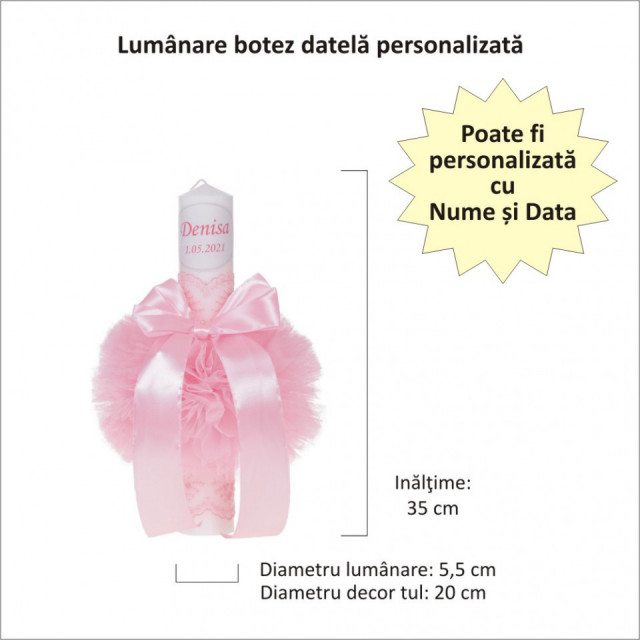 Lumanarea de botez este personalizata cu numele bebelusului si / sau data botezului.