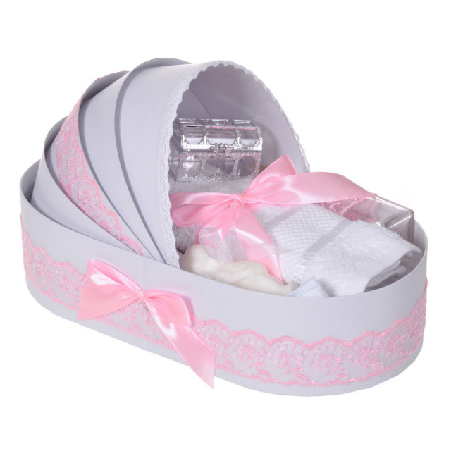 Lumanare botez personalizata si trusou botez in landou, decor dantela Roz, Denikos® 863DESCRIERE