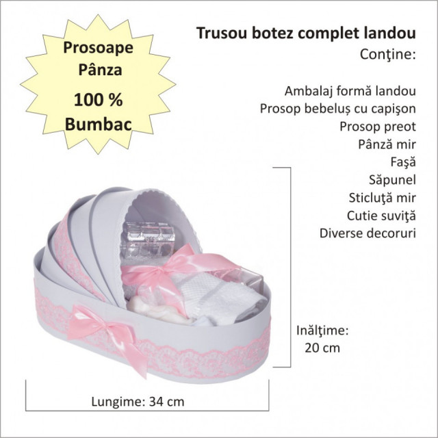 Set special creat pentru ceremonia de botez. Setul este alcatuit din trusou complet ambalat intr-o cutie tip landou si o lumanare personalizata cu numele copilului decorata cu un glob din tul roz, dantela si fundita asortata.