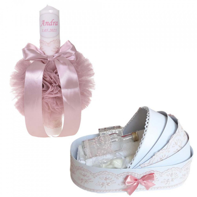Set special creat pentru ceremonia de botez. Setul este alcatuit din trusou complet ambalat intr-o cutie tip landou si o lumanare personalizata cu numele copilului decorata cu un glob din tul roz pudra, dantela si fundita asortata.