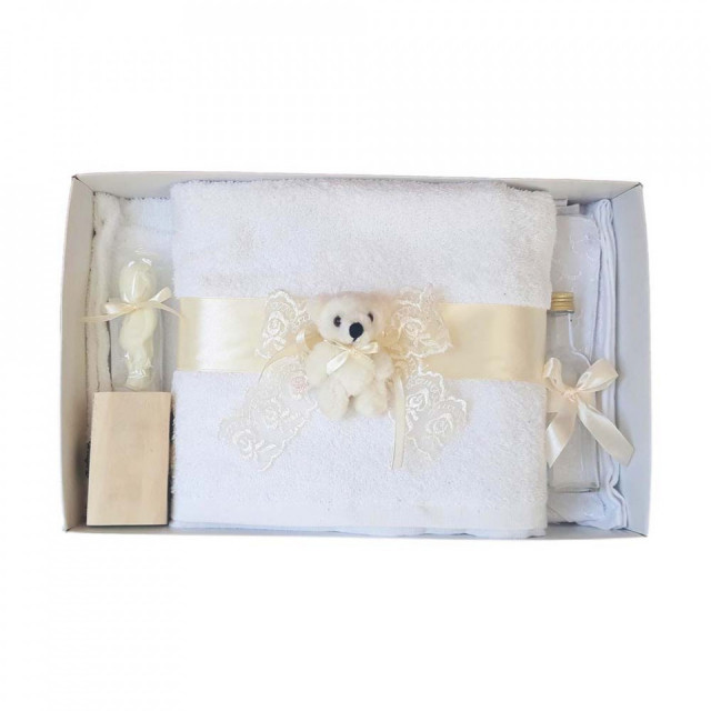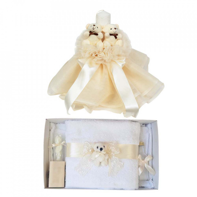 Set special creat pentru ceremonia de botez. Setul este alcatuit dintr-un trusou complet ambalat intr-o cutie dreptunghiulara si o lumanare decorata elegant cu tul, dantela, fundite asortate si 2 ursuleti simpatici.
