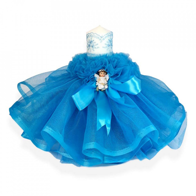 Lumanare botez tul turcoaz, fundita asortata si ingeras, Denikos® 408