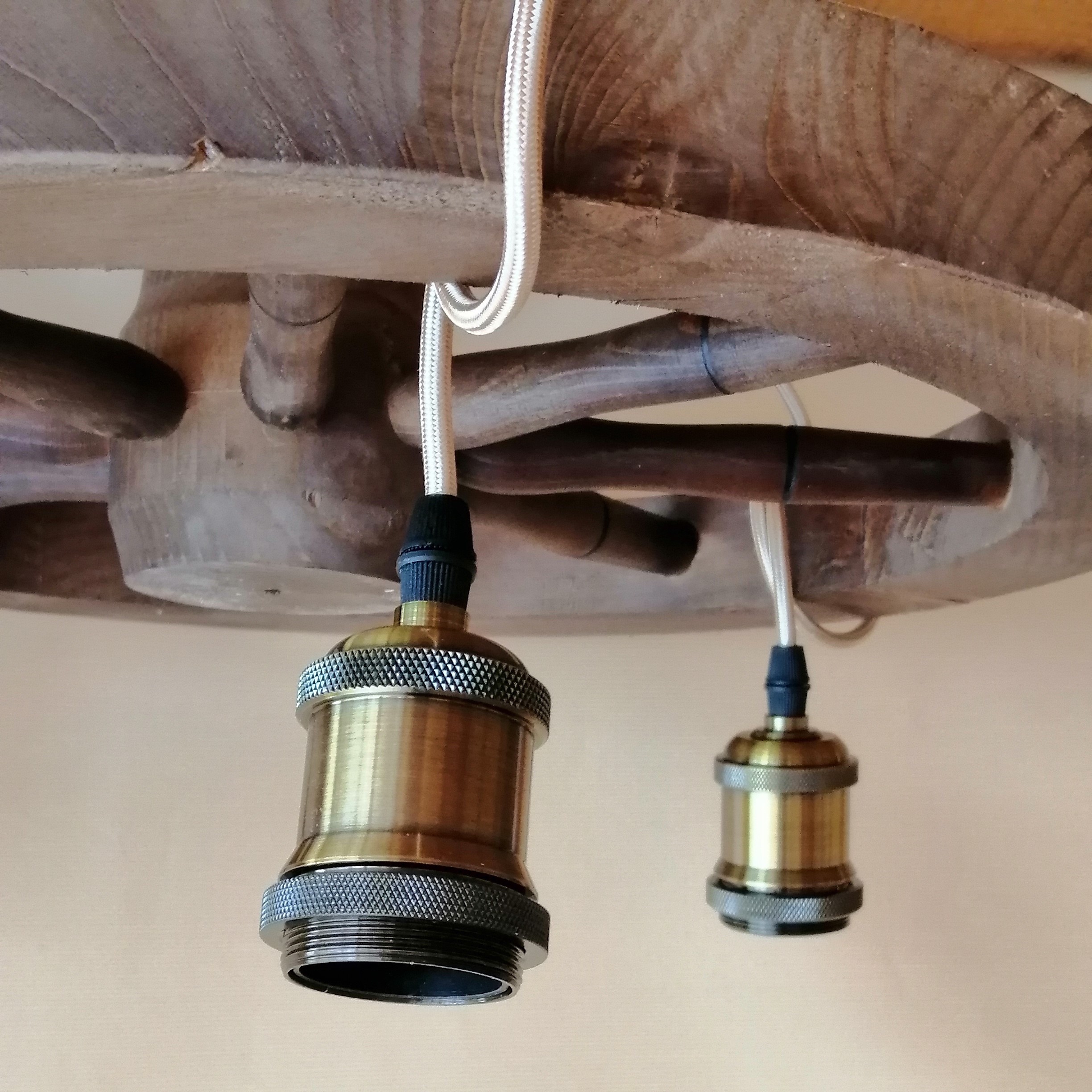 Lustra WoodWheelOutside este un superb corp de iluminat, suspendat printr-un cablu textil, inaltimea sa fiind reglabila intre 10 si 60 cm.