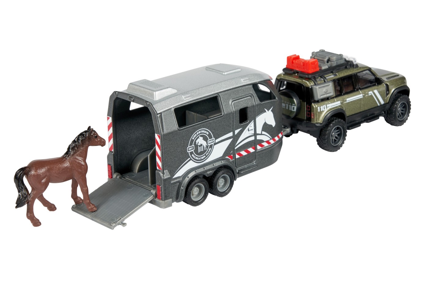 Majorette - Land Rover Defender cu remorca pentru cai combinatie premium vehicul/remorca cu cal de jucarie, efecte luminoase si sonore, numeroase functii, pentru colectionari si copii cu varsta peste 3 ani. Majorette Land Rover Defender Horse Carrier Pregateste-te pentru urmatorul turneu!Dispunand de o remorca pentru cai sic, acest model Land Rover are tot ce aveti nevoie pentru a transporta caii in siguranta. Cadoul perfect pentru toti fanii de masini si cai! Pe langa un design complex, modelul de vehicul Majorette vine si cu mai multe functii practice care sunt garantate pentru a distra copiii mici, inclusiv doua efecte sonore diferite, doua faruri si o lumina incorporata pe portbagaj care poate fi comutata. porniti si opriti dupa cum doriti. Cutia de acoperis poate fi deschisa pentru a dezvalui doua recipiente, un suport de tractiune, o scara si o cutie de depozitare. Usa din spate poate fi deschisa si pentru a accesa roata de rezerva in caz de urgenta. Remorca pentru cai este fabricata din metal si are o rampa de plastic pliabila pentru incarcarea si descarcarea calului.Descriere produs