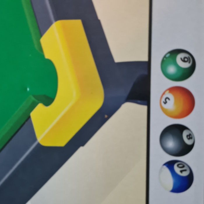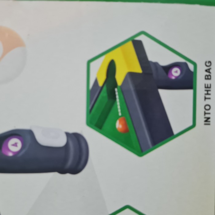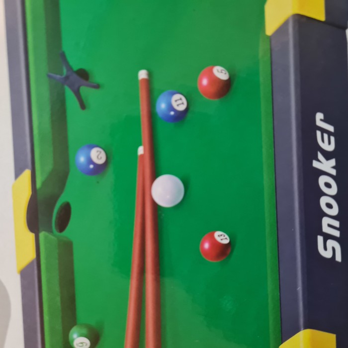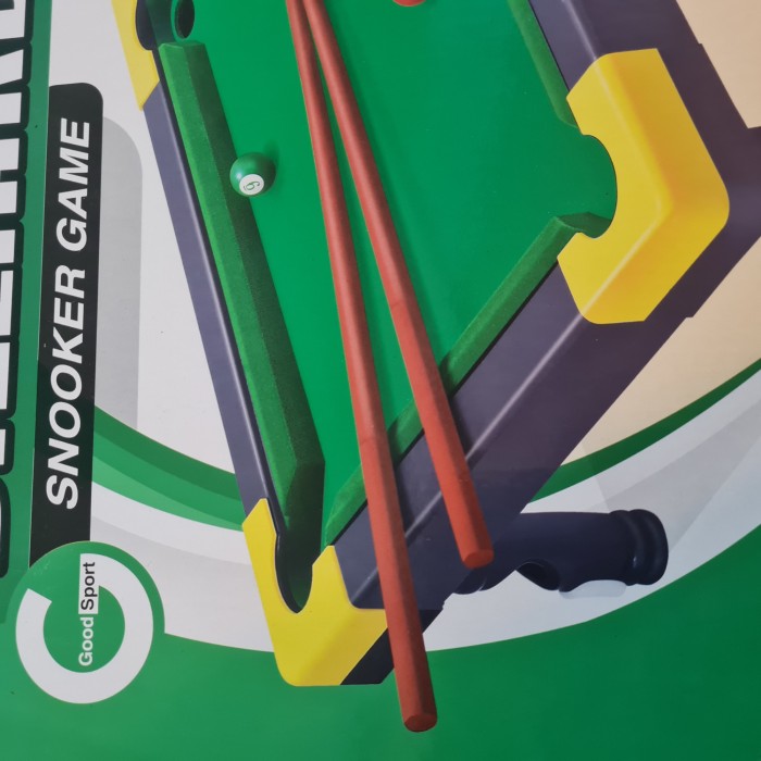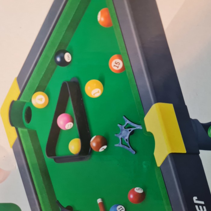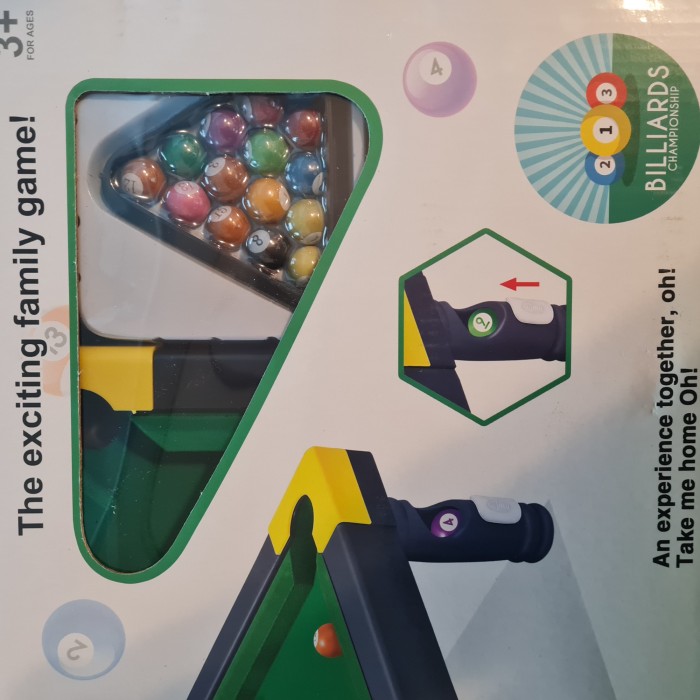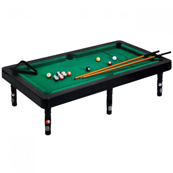 Masa de biliard din plastic, contine: 1 triunghi, 2 bete, 16 bile de biliard. Picioarele sale au un mecanism special care trage mingile inapoi spre tine.