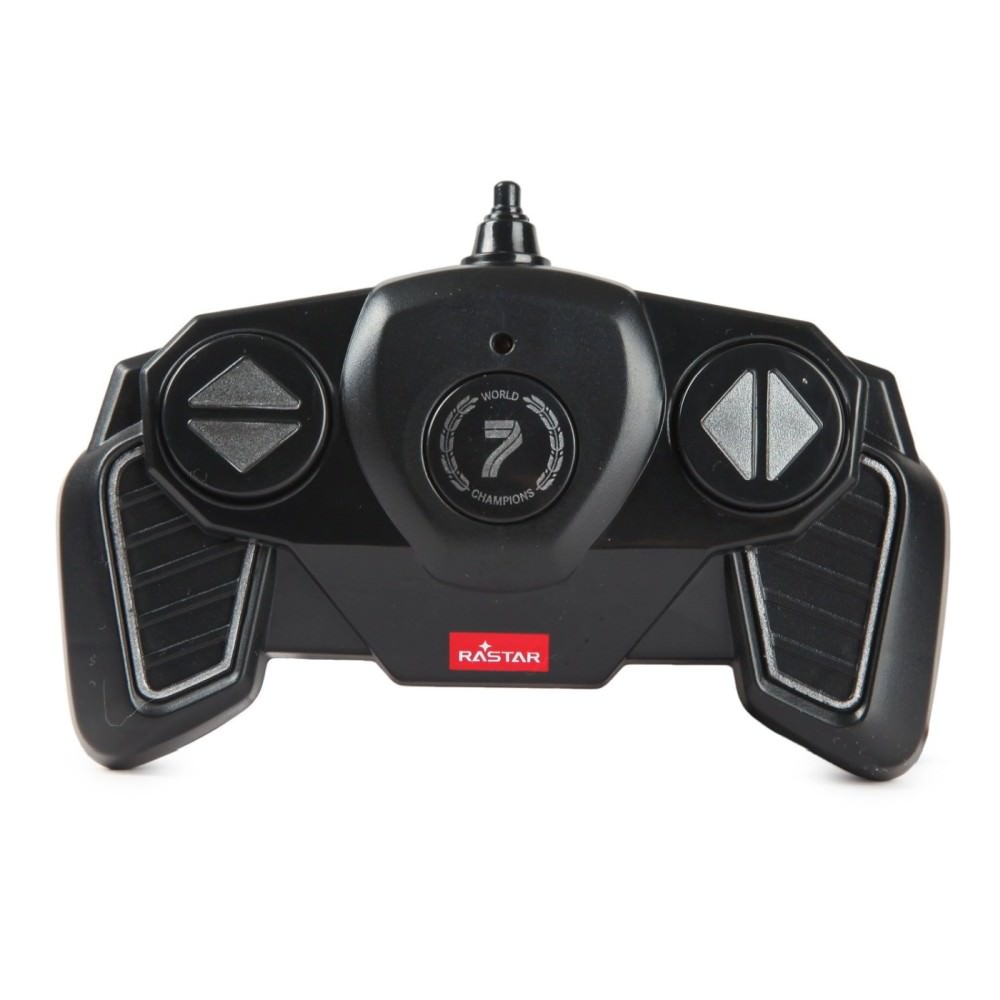 Masina cu telecomanda Mercedes AMG F1 W11 EQ Performance, scara 1 la 18, poate rula cu o viteza aproximativa de 10km/h, are tractiune 2WD, anvelope de cauciuc, posibilitate de reglaj a directiei direct pe sasiu si o raza de actiune a telecomenzii de circa 20 de metri.