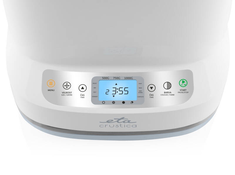 Caracteristici principale • Program PERSONALIZAT – permite setarea individuala a etapelor de preparare a painii • Selectie dimensiune paine: 0,5 kg / 0,75 kg / 1 kg • Selectie nivel rumenire: 3 trepte de intensitate a crustei • Forma de copt detasabila cu strat antiaderent – pentru curatare usoara • 1 carlig de framantare • Maner rabatabil practic pentru manipulare usoara a cuvei • Capac cu fereastra transparenta (BPA free) – pentru monitorizarea procesului de coacere • Afisaj clar cu indicarea stadiului de preparare • Semnal acustic pentru adaugarea ingredientelor suplimentare • Temporizator de 15 ore – functie de pornire intarziata • Functie automata de mentinere la cald (60 minute dupa finalizare) • Memorie in caz de pana de curent • Putere: 550 W Accesorii incluse Vas pentru copt, carlig de framantare, pahar gradat, lingura de masurat, carlig pentru extragere. 12 programe presetate • CLASIC – pentru paine alba din grau sau paine din secara bruna, dar si pentru paine aromata cu ierburi sau stafide • RAPID – pentru prepararea rapida a painii albe, de grau sau de secara; painea obtinuta este mai mica si are un miez dens • DULCE – pentru paini dulci, cu o crusta mai crocanta decat in modul clasic • INTEGRAL – pentru paine din faina integrala, cu continut redus de gluten • FARA GLUTEN – pentru prepararea painii fara gluten • ALUAT – pentru framantare si dospire fara coacere; ideal pentru rulouri, pizza, chifle etc. • FRAMANTARE – doar framantare (fara dospire); potrivit pentru diverse tipuri de aluaturi • PRAJITURA – pentru amestecarea ingredientelor de prajituri, checuri sau tarte, urmand apoi coacerea automata • GEM – pentru prepararea gemurilor sau marmeladelor din fructe proaspete • IAURT – pentru prepararea iaurtului de casa • COACERE – pentru coacerea painii brune, a prajiturilor sau a ruladelor din carne • PERSONALIZAT – permite reglarea individuala a tuturor etapelor de preparare a painii GearDrive – sistem de antrenare fara curea a carligului de framantare Prima masina de paine fara curea de transmisie. Pentru actionarea carligului de framantare este utilizata o cutie de viteze fiabila, fara intretinere, conectata la un motor DC puternic. Acest sistem elimina riscul ruperii curelei si asigura o durata lunga de viata a aparatului. Preparare complet automata Masina asigura framantarea, dospirea corespunzatoare, coacerea de calitate si mentinerea temperaturii dupa finalizare – fara a necesita interventia dumneavoastra. Utilizare multifunctionala • Coacerea diferitelor tipuri de paine (sarata, dulce, alba, integrala sau fara gluten) • Pregatirea diverselor tipuri de aluat, gemuri, marmelade, prajituri, checuri, biscuiti, rulade, chiftele, iaurturi etc. Coace paine de casa exact pe gustul tau Prepara paine proaspata dupa preferintele tale cu masina de facut paine ETA Crustica 4150 90000 . Coacerea nu a fost niciodata mai simpla ! Tot ce trebuie sa faci este sa adaugi ingredientele, sa alegi unul dintre cele 12 programe presetate, iar aparatul se ocupa de tot restul. Poti pregati o paine doar pentru tine sau pentru intreaga familie, alegand dimensiunea potrivita a painii (0,5 kg, 0,75 kg sau 1 kg ) si nivelul de rumenire al crustei. Capacul este prevazut cu o fereastra transparenta din plastic ( BPA free ), care iti permite sa urmaresti procesul de coacere fara a pierde caldura din interior. Sistem unic GearDrive – functionare silentioasa si durabilitate ridicata Baza masinii ETA Crustica este sistemul inovator GearDrive ce combina o transmisie fara curea cu un motor DC puternic. Datorita acestui concept, aparatul este extrem de fiabil, functioneaza silentios si are o durata lunga de viata. ETA Crustica coace mai mult decat paine Datorita celor 12 programe presetate, masina ETA Crustica poate prepara mult mai mult decat painea clasica. Fara efort, poti coace paine integrala, dulce sau fara gluten, poti pregati aluat pentru pizza sau prajituri, dar si gemuri si iaurturi de casa fara conservanti. Painea calda va fi gata cand te trezesti Trezeste-te in mirosul painii proaspete ! Cu ajutorul temporizatorului de 15 ore , poti programa coacerea astfel incat painea sa fie gata exact cand ai nevoie. Datorita functiei de mentinere la cald, painea ramane proaspata si calda chiar daca ajungi acasa mai tarziu.Descriere produs