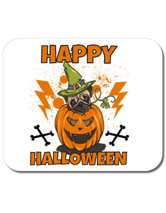 Mousepad personalizat Halloween Pug Alb• Este fabricat din suprafață textilă ce permite sublimarea la presele termice și burete termorezistent.