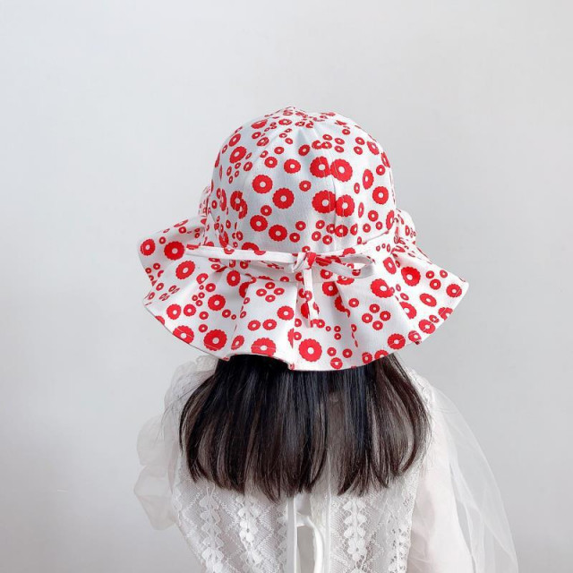Palariuta pentru fetite, cu bor mare, imprimata cu floricele. Este prevazuta cu o fundita si cu elastic sub barbie.