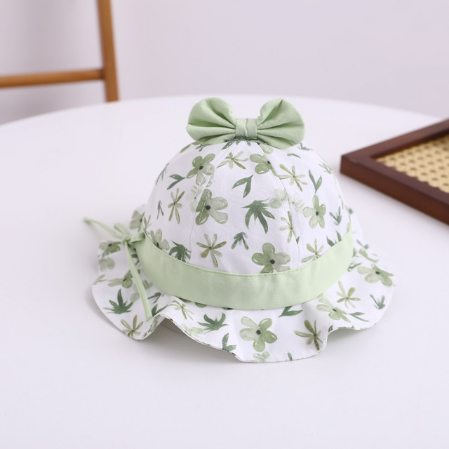 Palariuta pentru fetite, cu o fundita verde aplicata, imprimata cu floricele in nuante de verde pe fond alb. Este prevazuta cu elastic sub barbie.