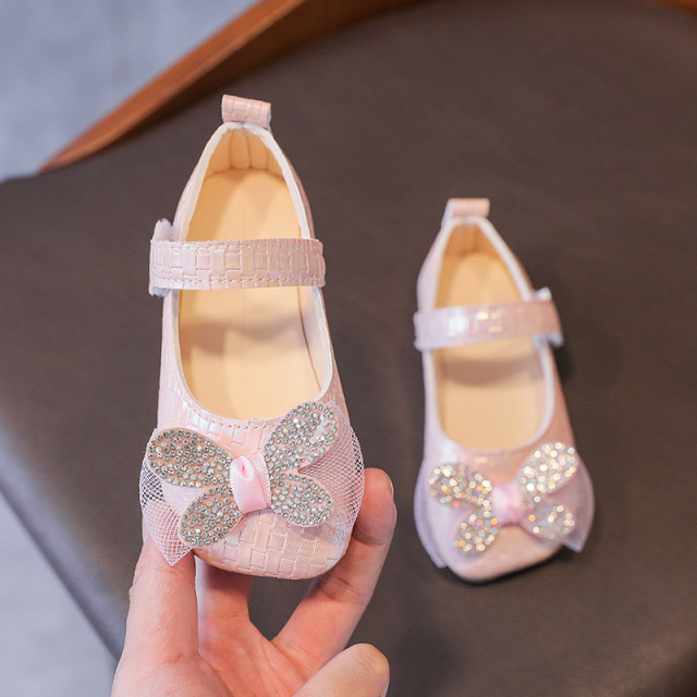 Pantofiori pentru fetite, din material tip piele ecologica, cu o fundita din tulle si un fluturas din strasuri aplicate in fata. Sunt foarte potriviti pentru tinutele elegante ale micutelor domnisoare.
