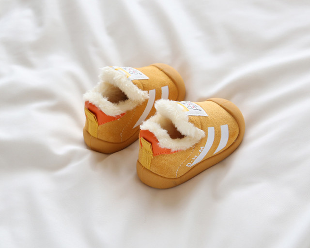 Pantofi imblaniti pentru copii, din material tip piele intoarsa, cu dungi laterale albe.