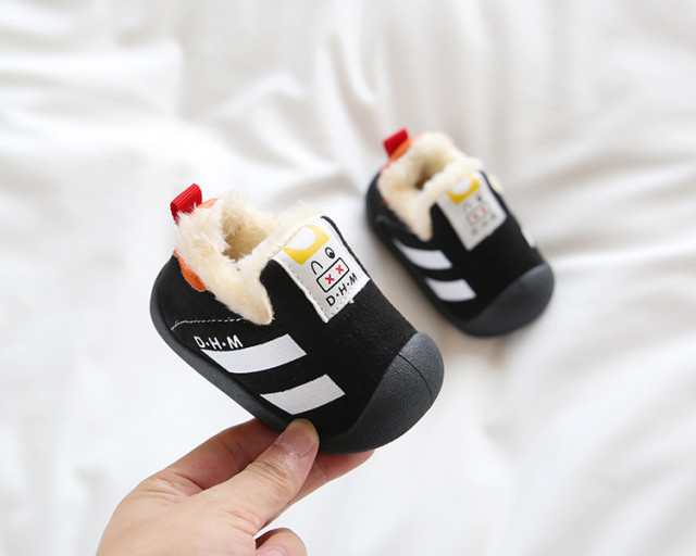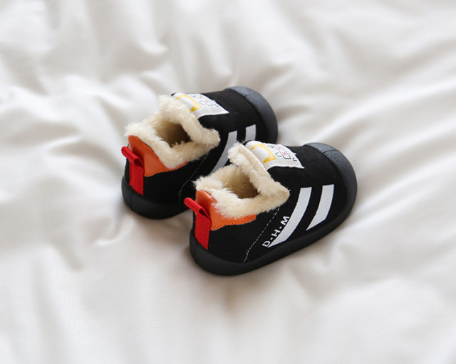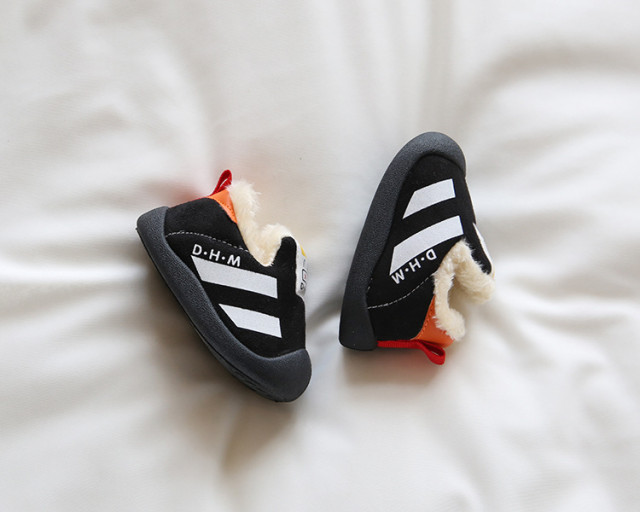 Pantofi imblaniti pentru baietei, din material tip piele intoarsa, cu dungi laterale albe.