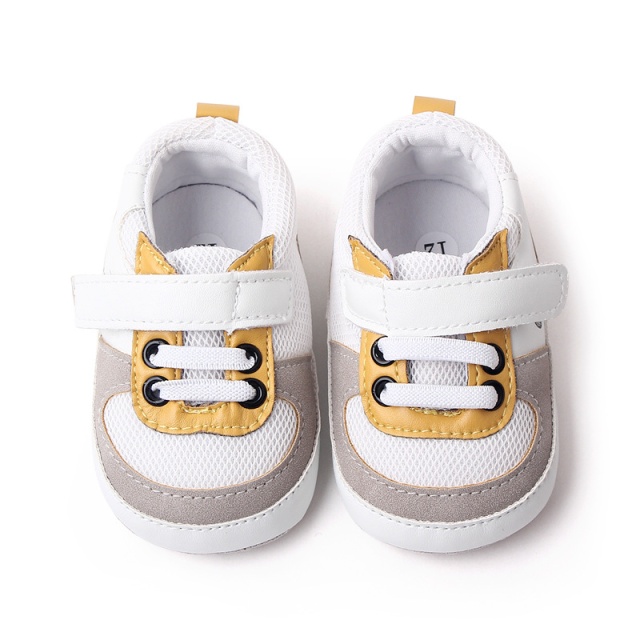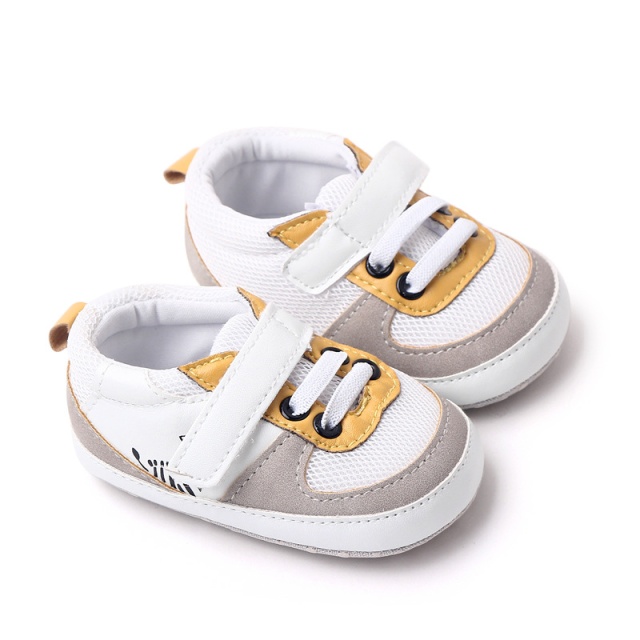 Pantofi sport pentru bebelusi, de culoare alba, cu detalii galbene si gri, ideali pentru primii pasi ai micutului.
