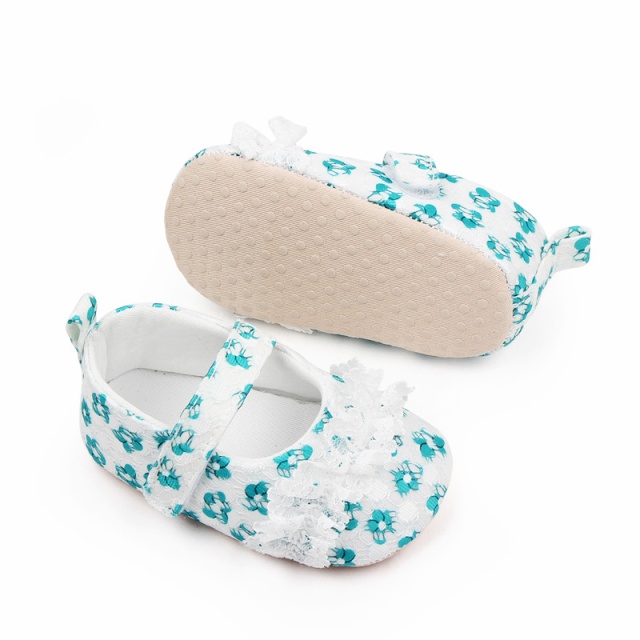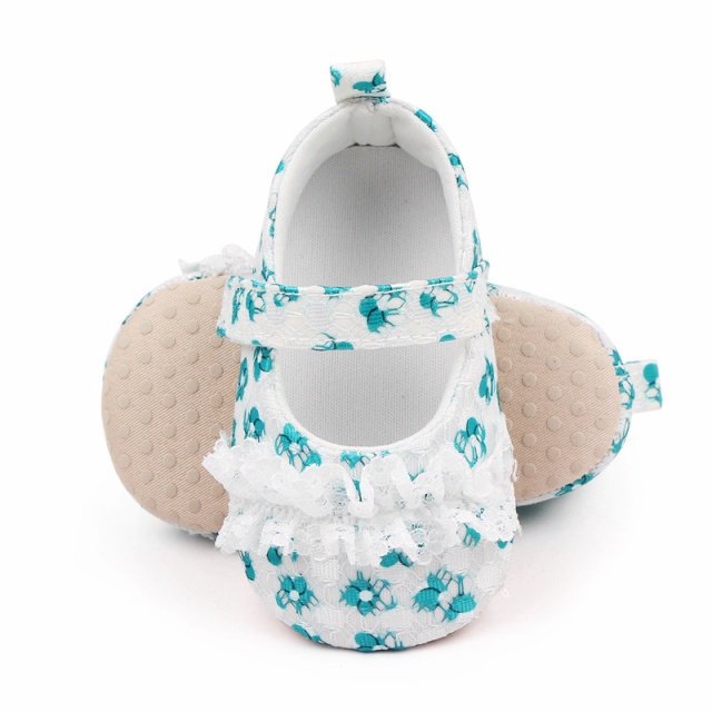 Pantofiori pentru bebelusi, confectionati din materiale textile moi, cu un imprimeu floral delicat in nuante de alb si verde.