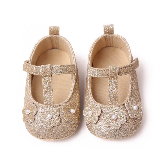 Pantofiori pentru fetite din material textil cu sclipici auriu, cu floricele aplicate in fata. Se inchid cu bareta cu arici intr-o parte.