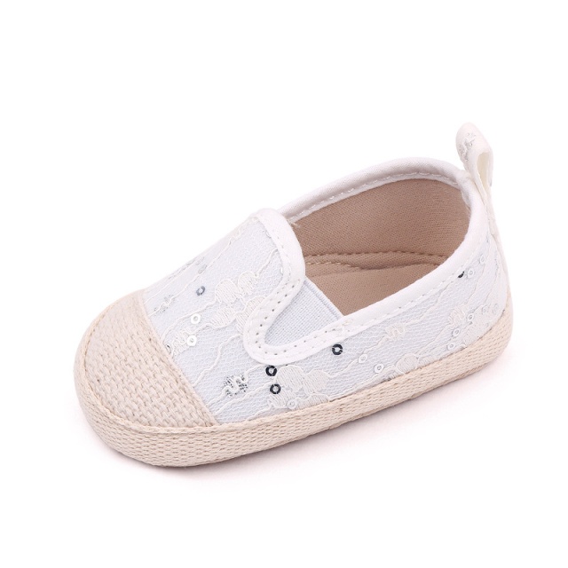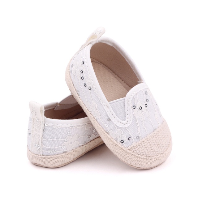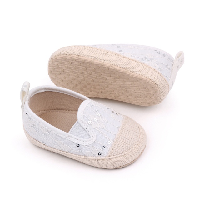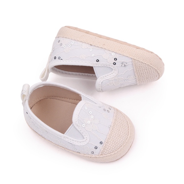 Alege pantofiorii bebelusi ivoire, cu aplicatii de dantela si paiete, pentru un plus de eleganta si confort.