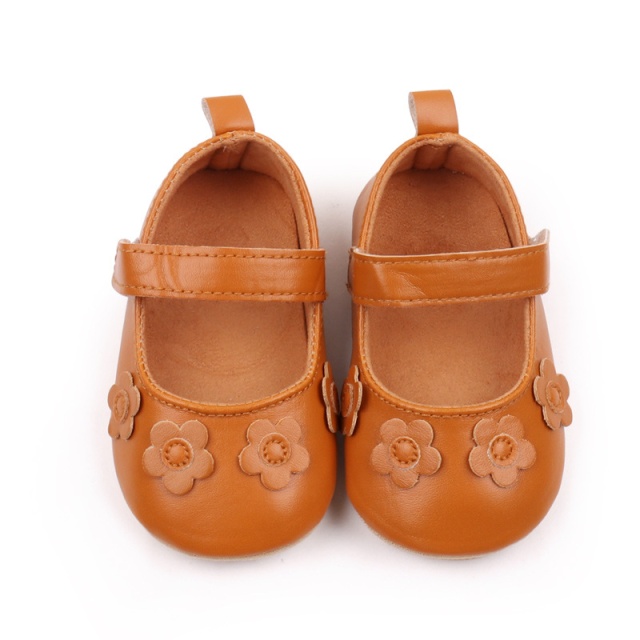 Pantofiori bebelusi maro din piele ecologica, decorati cu flori aplicate, sunt ideali pentru primii pasi.